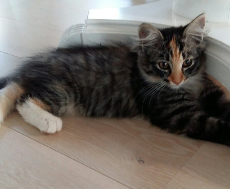 Kattunge: tigerstripet med hvite poter, hvit bringe og mage, rød/beige nese og en liten rød flekk på ene øret. Hun har veldig lang hale. Gule øyne. Veldig skjønn, snill og leken. Hadde på seg et lilla halsbånd med bjelle på når hun forsvant.