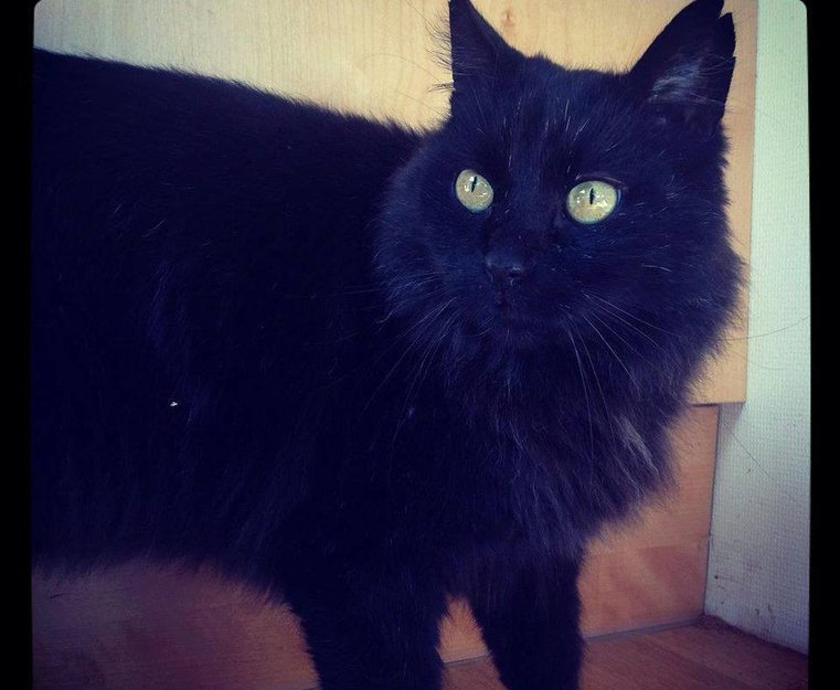 Sort skogs katt, merket i øret, en liten knekk på halen, noen små hakk på øret.