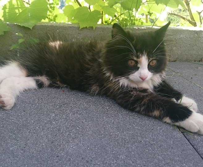 Semilanghåret hunnkatt, mørk med brune spetter i pelsen. Hvite sokker og hvit på halsen og over nesen og munnen. Tillitsfull og kosete.