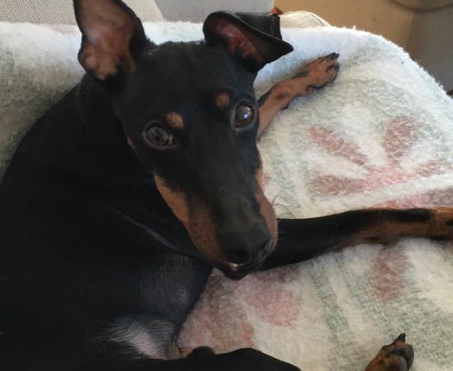 Svart med brune områder rundt ansikt og på poter. Har underbitt. Har på seg halsbånd og gåsele med merket "puppia".