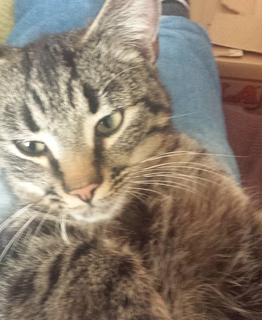 Stripet katt med svart bred stripe på ryggen. Litt mørk pels rundt munn.