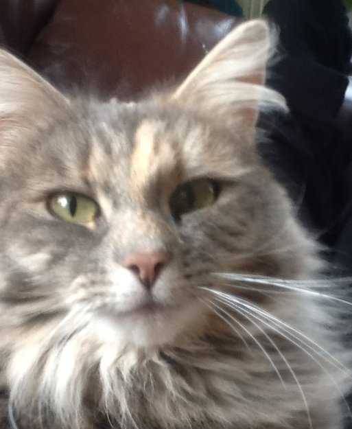 Langhåret grå dame, med gylne toner. Nylig operert ut en hjørnetann. Har noe ugjevn pels lengde da hun har vært barbert for kladder og operasjonen.