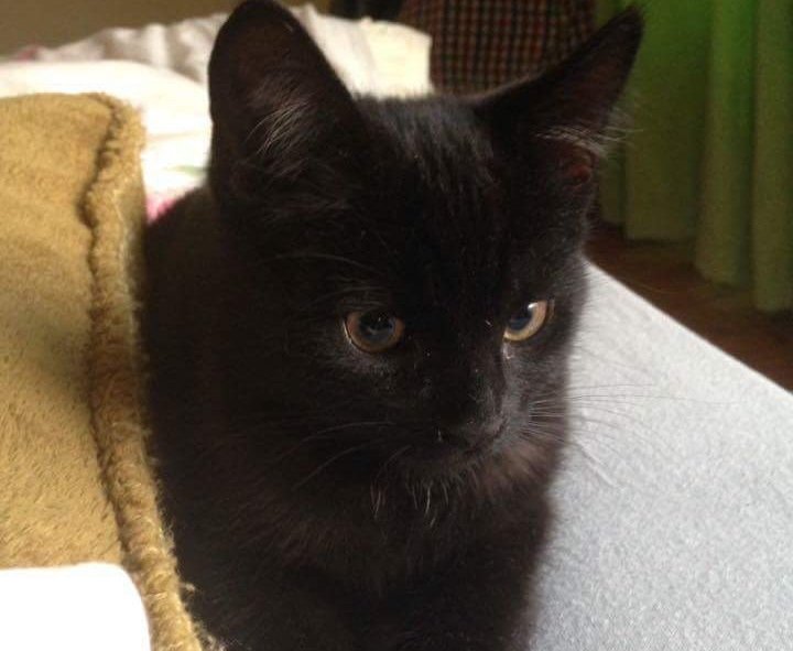 Svart katt med noen hvite hår på brystet. Øyenfargen hans er gul. Lyder navnet Rod-sei.