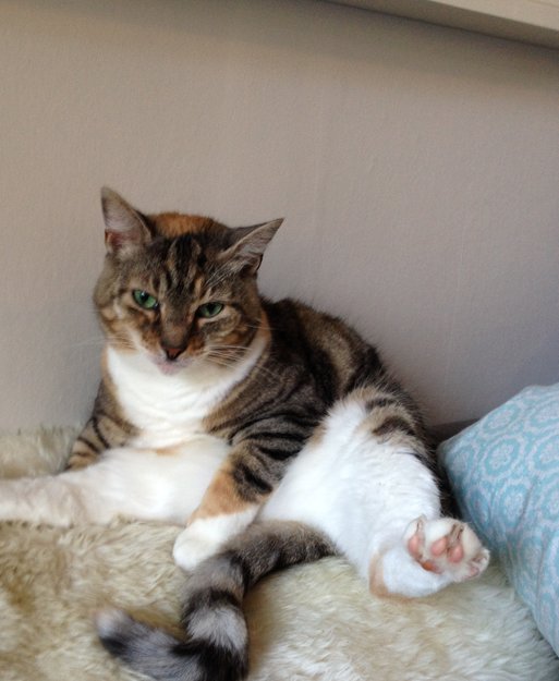Bruntigret, hvitt på hals, mage og ben. Hun har også noen orange flekker. Grønne øyne.