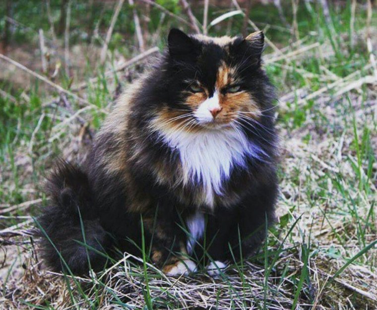 Hu e skilpaddetabby, lang pels med litt krøller i. Hu ser god å rund ut, men det é på grunn av pels.