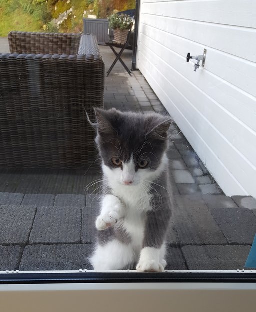 Den er svært kontaktsøkende, rundt 10-12 uker kanskje. Står og skraper på vinduet siden i går. Fått litt mat.