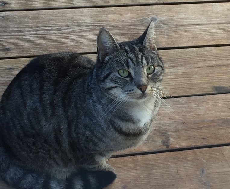 Fin stor katt, antagelig kastrert hannkatt med et litt heng ved magen. Fin pels, virker godt stelt, men sulten. Gule øyne. Kosete. Ikke tatovering i øret, vet ikke om den har chip. Vanskelig å oppgi kjennetegn da den er vanlig tigerstripet, men har litt oransjaktig/brunlig pels rundt/under snuten, altså ikke hvitt eller grått.