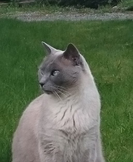 Katinas siamo ir britų trumpaplaukio mišrūnas. Akys mėlynos spalvos.