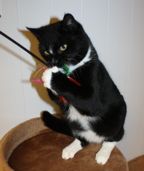 Liten, ganske tynn og sort hannkatt. Hvit hake og bryst, hvite føtter, noen få hvite hår på nesen. Veldig sky, men liker kos når han blir trygg.