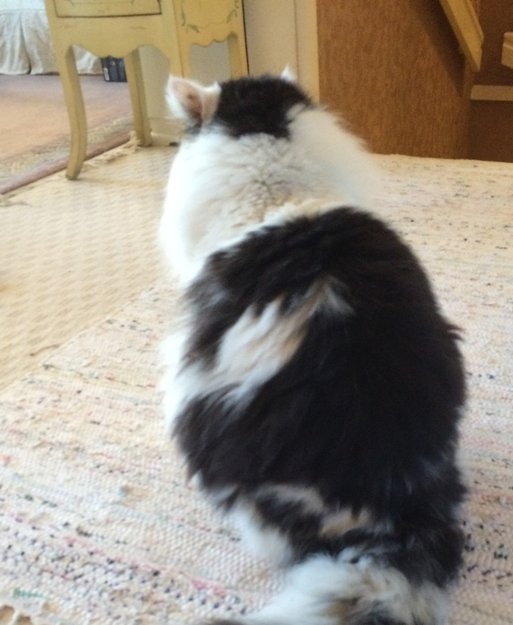 Det er en stor hannkatt ca 5,5 kg med nydelig lang svar og hvit pels pels og en stor tykk hale rett til værs <3