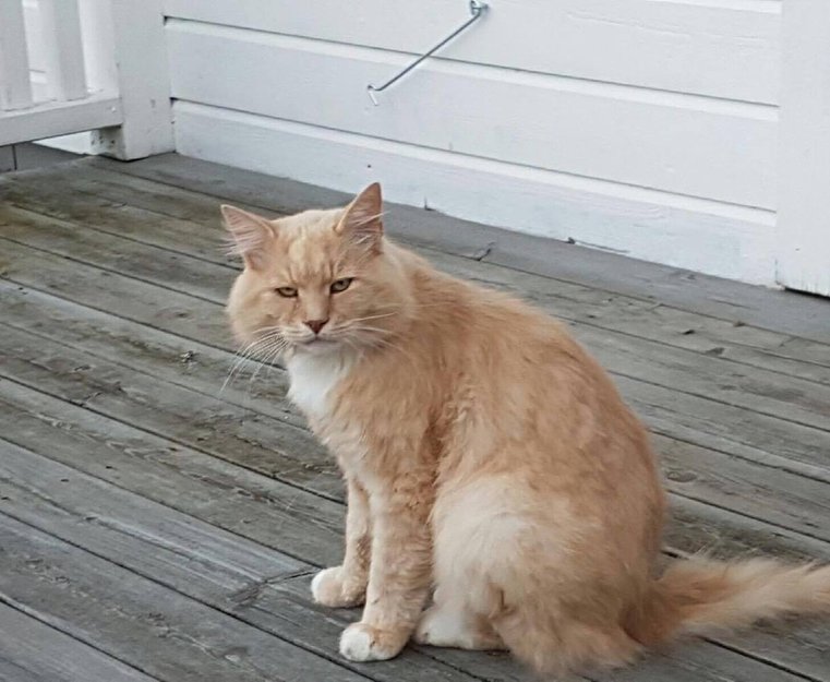 Momba hadde bare vært i sitt nye hjem i 2 døgn da han hoppet ut fra et soveromsvindu i 2-etasje. Han er ikke kjent i området, og veldig redd fremmede ute. Han er en relativ stor orange/brunguk og hvit langhåret hannkatt. Han har en litt pjuskete hale iforhold til den ellers så staslige pelsen. Hvitt på alle fire poter, og bryst og mage.Han er ca 3 år, så fullvoksen.