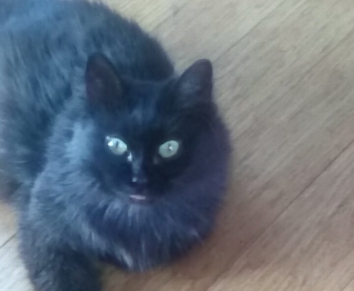 Hun er helt sort, langhåret og veldig skvetten. Beste kjennetegnet på henne er at hun mangler ene hoggtannen sin.
