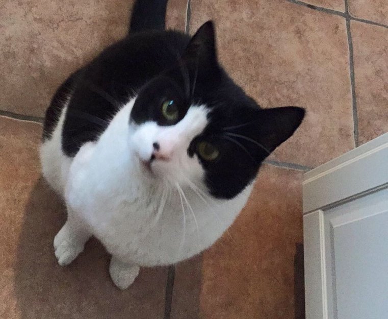 En stor hannkatt på rundt 8 kg. Han har en svart maske som strekker seg over ørene og rundt øyne og litt bak i nakken. Svart på ryggen, med en hvit stripe ved nakken, og hvit på magen. En liten svart flekk på venstre siden av nesen.