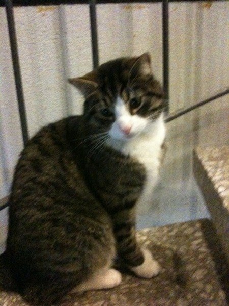 Veldig kontaktsøkende og søt katt. Tigerstripet med hvitt brøst og hvite poter.
