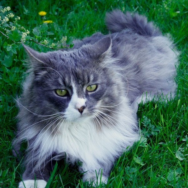 Stor katt (ca 8kg), lang tykk hale, tykk lang pels, mjauer høyt.
