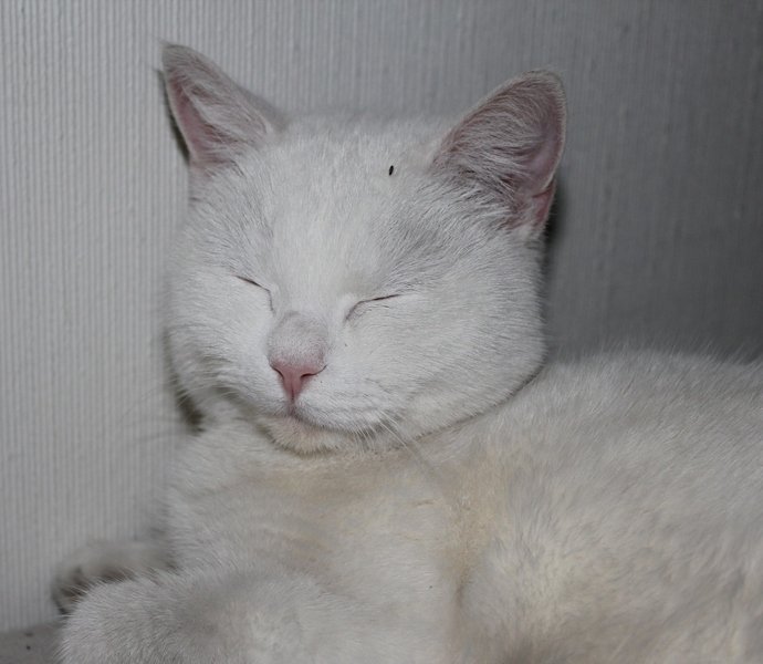 Freia er helt hvit med gul/grønne øyne. Hun er liten, skeptisk og redd for alt nytt. Hun ble operert 9.februar så skal ha en bandasje på magen, men det kan hende hun har fjernet den.