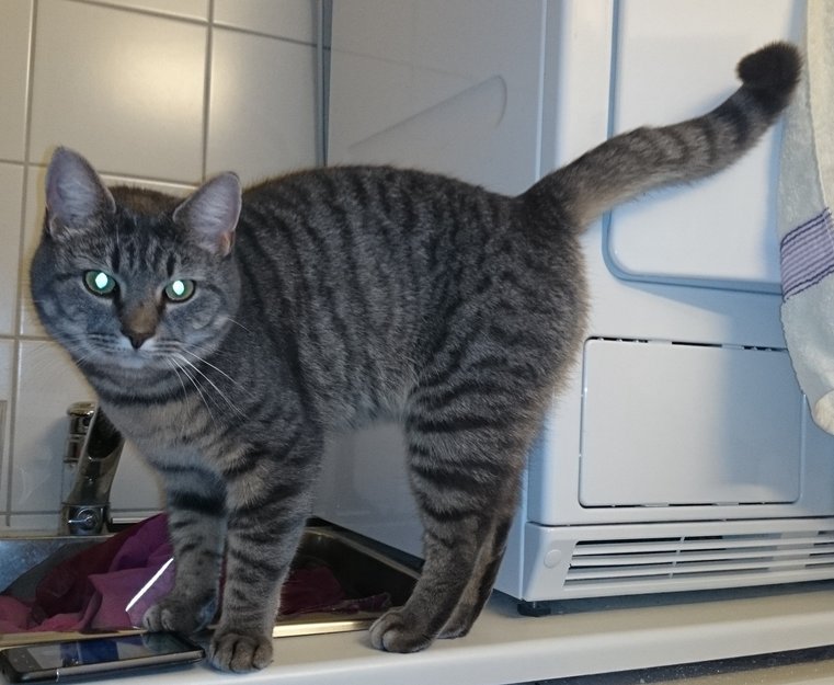 Liten kosete og tillitsfull hannkatt. Lys grønn tatovering i venstre øre. Lite hakk i høyre øre etter slosskamp.