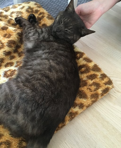 Svart og grålig pels med tabby mønster. Veldig sosial. Ekstremt tynn og har rennende øyne.
