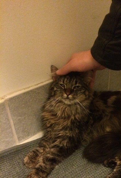 Levert til Dyrebeskyttelsen Sør-Trøndelag. Observert flere dager på rad sittende ved veien, så pjusk og uflidd ut med en hel del tovede pelsballer over store deler av kroppen-spesielt på sidene og langs hele magen. Var svært kontaktsøkende og fulgte etter meg over alt og jeg tok han omsider med meg inn etter jeg gav henne mat og vann og så hvor sulten hun var. Har prøvd og børstet en del og klippet mye av pelsballene, men de fleste er så store at pelsen nok bør barberes...