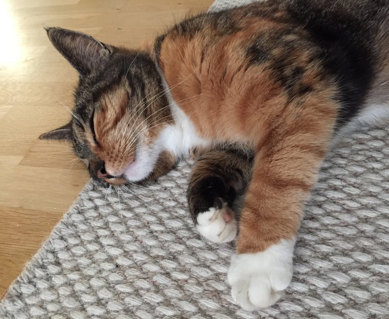 Liten (ungkatt?), veldig kosete og kontaktsøkende, maler lite/veldig lavt og mjauer med litt "dyp" stemne. Er sjekket for chip hos veterinær.