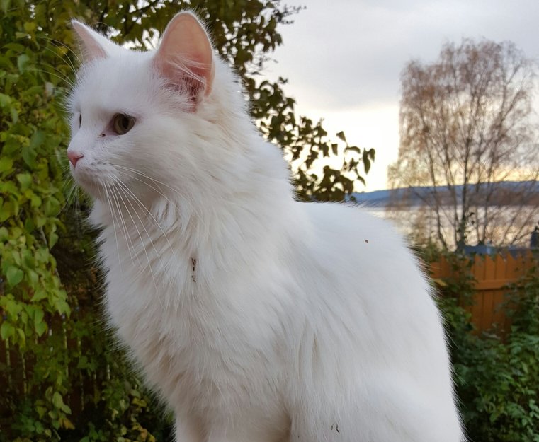 Melis er 2 år, helt hvit med grønn/gule øyne, liten og smal av vekst. Hun har hvit halvlang pels men har nå sommerpels og kan virke mere korthåret. Hun er ikke døv som hvite katter ofte er.