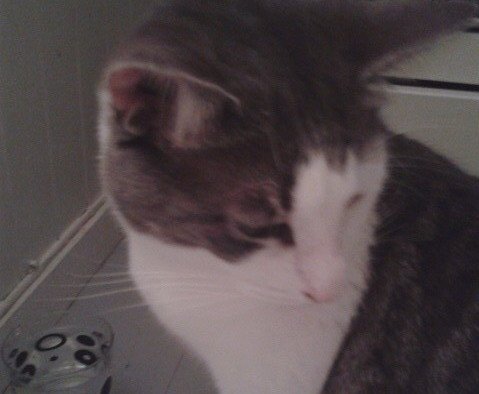 Grå og hvit, svart markering rundt det ene øyne (hans høyre), grå hale, hvite poter, mjauer en del. Sosial og snill.