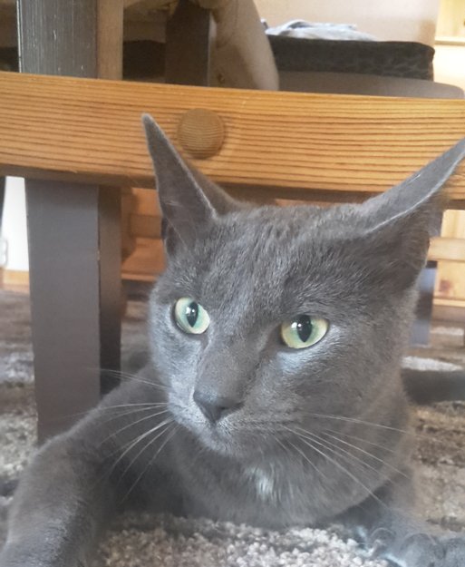 Han er helt grå med liten hvit flekk på brystet. Veldig fin i pelsen og veldig kosete. Snakker mye. Ingen merker eller sår men ganske tynn. Holder til i risbakken. Har ikke forlatt hagen siden den kom.