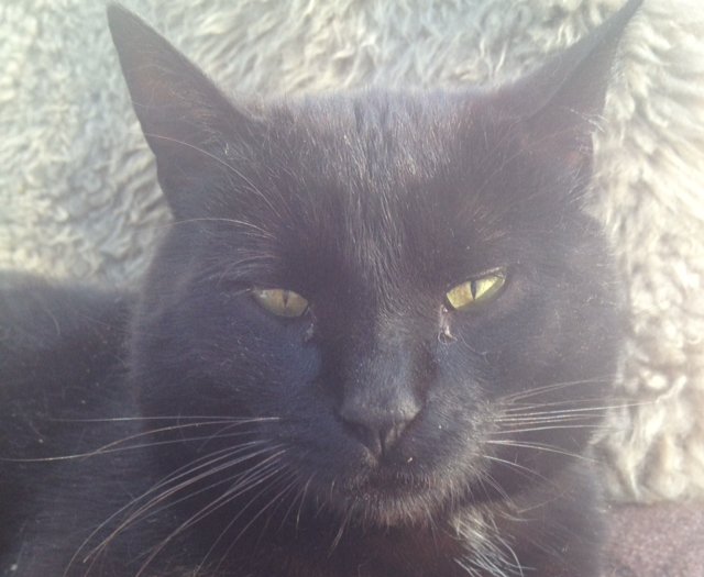 Han er svart med litt kvitt under haka/ bryst. Korthåret og noko sky. Veldig snill katt.