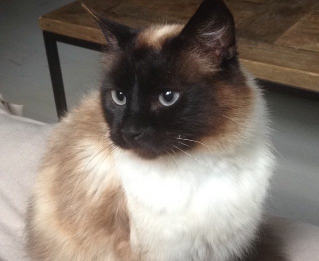 Mørk brun i fjes, hale og poter. Hvit under hake og mage. Lysebrune sjatteringer på rygg. Blå øyne.