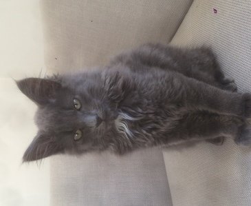 Grå pjuskete pels med en bitteliten hvit flekk i halsen. Kattunge.
