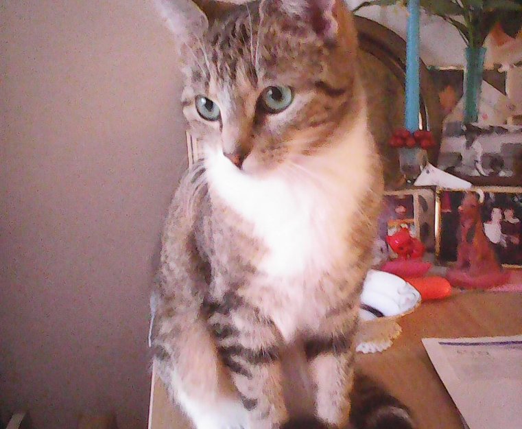 Hun er 2 år og 3 mnd. Men er ikke så stor, pene grønne øyne, hvite poter. En svært nydelig katt. Den var en flott, frisk og nydelig katt.