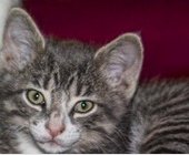 Fjeset på bilde mer eller mindre det samme, men mer spisse ører og lengre pels. Samme øyne som på bildet.Spraglete/stripete hvit/sort/grå. Rosa nese, lange følehorn, medium lang pels, lang pelshale. Ser veldig bamsete ut i fjeset, litt skremt og liten i størrelse. Når blir redd så lager hun knurrelyd.