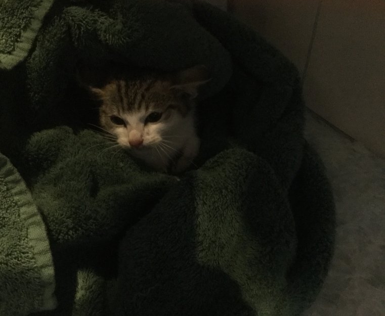 Dette er nok en kattunge som er født ute. Og har derfor ingen eier. Hun har valgt å adoptere oss, så historien har endt godt.