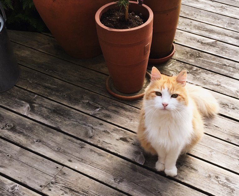 Buster er hvit i ansiktet og på bryst/mageregionen. Han har en stor, oransje og hvit-mønstret bustete hale. Det ene benet er hvit og oransje-stripet. Øremerket i venstre øre.