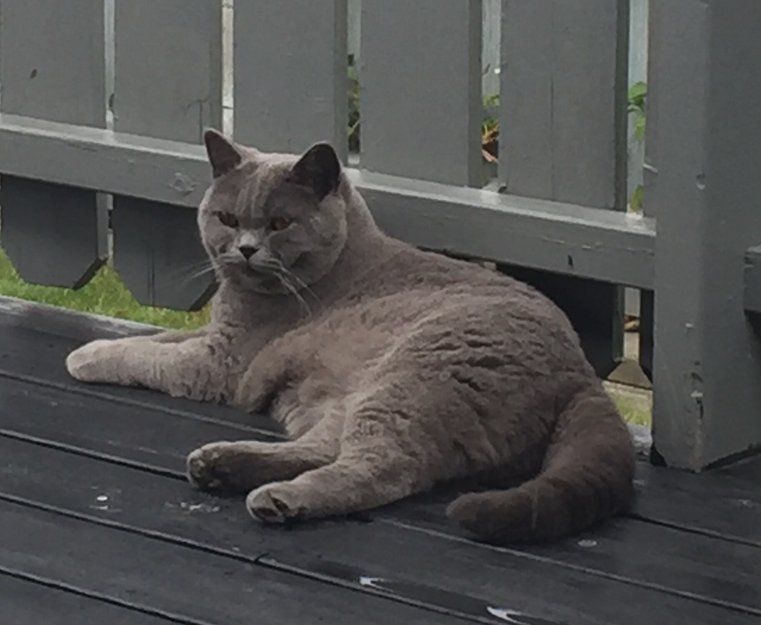Grå, med kobberfarget øyne. Litt hengende mage. Flink til å rulle kråke :-)