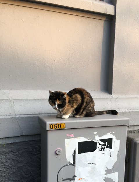 Rim er en trefarget (svart, hvit, oransje) hunkatt på tre år. Hun er vanligvis hjemmekjær og forsiktig med fremmede.