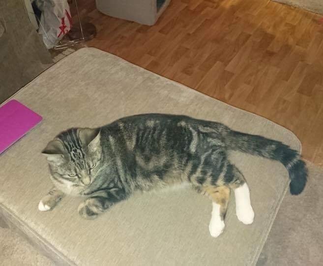 Liten hunnkatt på litt over 4kg hun er gråbrun svart med hvite sokker og litt hvitt på haken