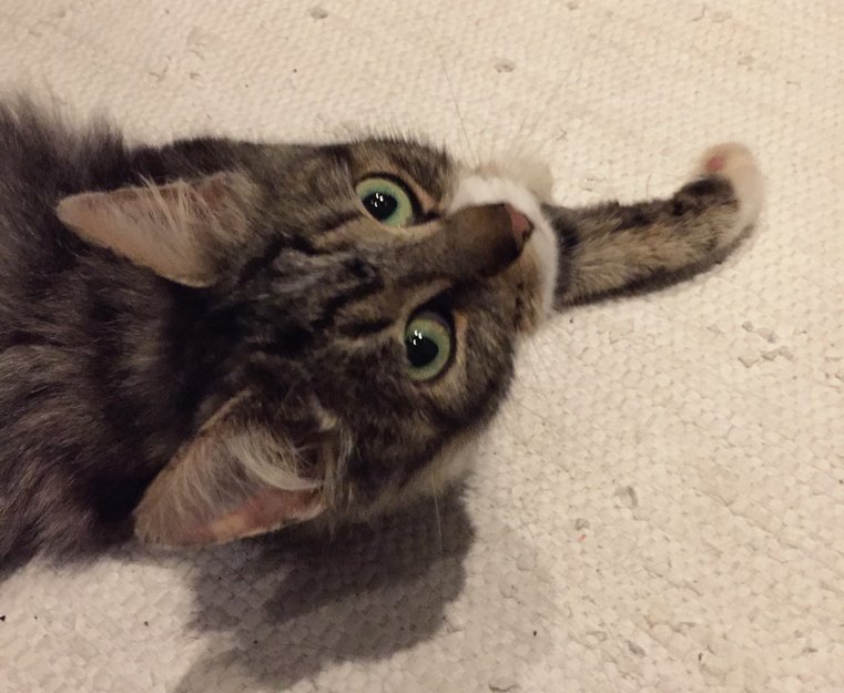 Sort og gråbrun stripete katt (ca4-5mnd) funnet i Leinsgrenda på Mære. Veldig tillitsfull og kosete. Har vært observert i området i 1-2 uker.