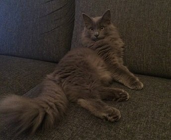 Kastrert, id-merket og chippet. Liten av vekst. Ble 2 år i mai 2016. Helgrå lang pels. Skeptisk overfor fremmede.