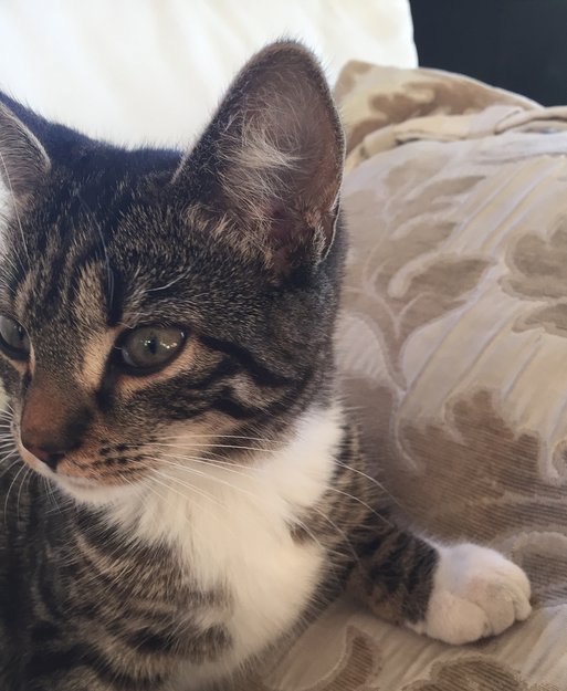 Liten kattunge, sort og gråstripete satt ved utenfor Kaffebarn på Kolbotn Torg.