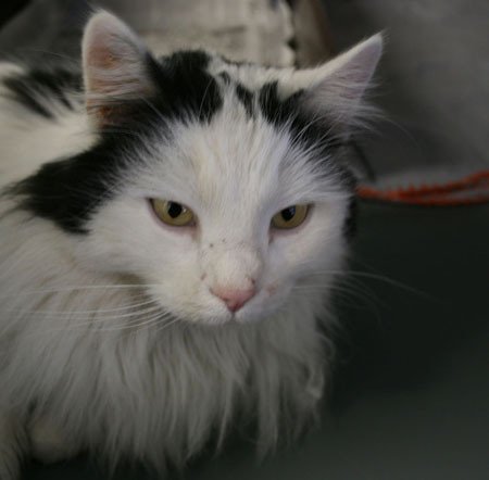 Tillitsfull og selskapssyk dame med langhåret hvit og sort pels. Noe sort på hodet og ryggen, ellers hvit.