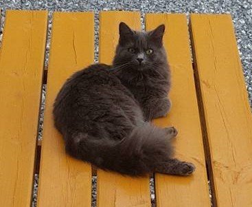 Grå/blå langhåret pels og bustete stor hale. Liten av vekst selvom hun er fullvoksen. Veldig intenst blikk.