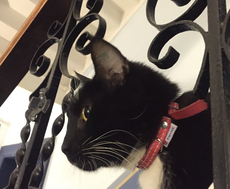 Katt med tre bein funnet i oppgangen vår. Svart og hvit. Rødt halsbånd det står Trine på. Merket med M i øret.