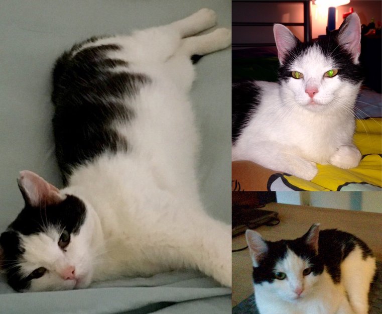 Sort og hvit. Alle poter er hvite. Rosa nos.