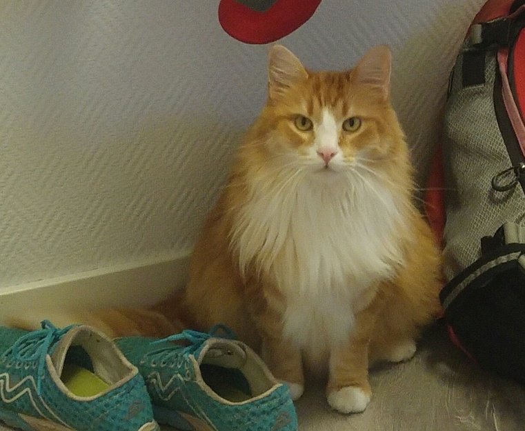 Stor hannkatt på 6,6 kg. Alle poter er hvite. Litt hvit i ansiktet og hvitt bryst. Ellers orange. Han har et 2x2 cm utslett i nakken hvor pelsen er borte. Han har tatovert en M i høyre øre. Han har en svart "føflekk" på underleppen.