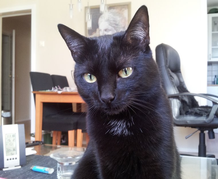 Hun har en liten hvit flekk på halsen og har lengre pels under buken siden hun blitt kastrert.