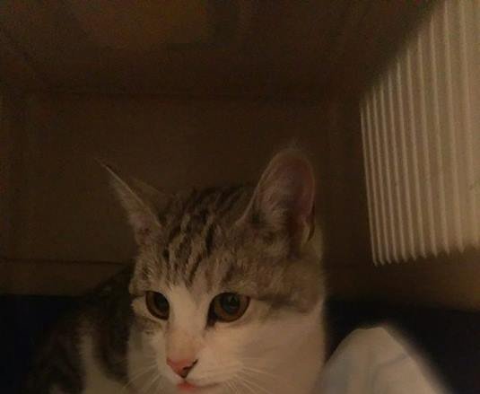 Uchippet hunnkatt funnet ved Gystadmarka skole. Gått rundt i to ukers tid der. Stor katt, tynn/normal.