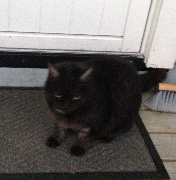 Katt som holder seg utenfor huset her, siste to dager. Virker gravid. Grå svart. Svaker grå striper på forbein. Er bekymret for om den har kommet seg bort fra hjemmet.