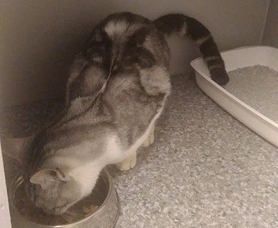 En dame leverte i dag en grå og hvit katt hun fant i skogen, rettere sagt mellom Gystadmarka skole og læringsverkstedet barnehage.