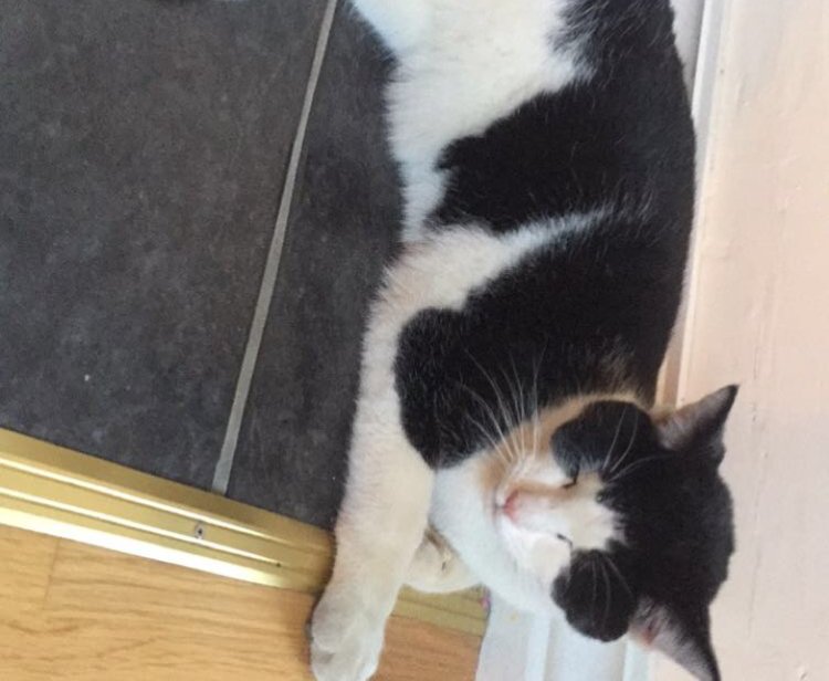 Katten er svart på ryggen, og på hodet. Når du ser katten bakfra er den hvit bak ørene. Hvit store deler av magen. Ser litt ut som at det ligger et svart teppe over ryggen til katten. Veldig rolig og tillitsfull. Rolig rundt barn.